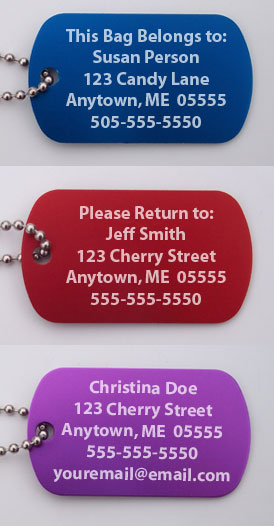 The images on these quality bag tags are laser-etched on to one side of a colored 1-1/8"x2" anodized aluminum pendant. Your custom text can be engraved on the reverse side for free! The 4-1/2" nickel-plated ball chain is sturdy and well made. All of our Bag Tags are 100% made in the USA! Choose from 3 colors.Custom text can be engraved on the reverse side of our bag tags for FREE!