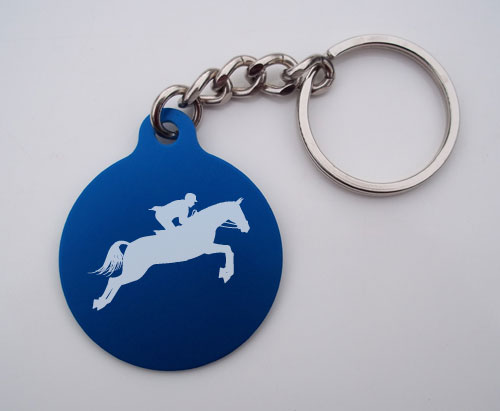 The image on this key chain is laser-etched on to one side of a colored anodized aluminum pendant. Your custom text will be engraved on the reverse side.